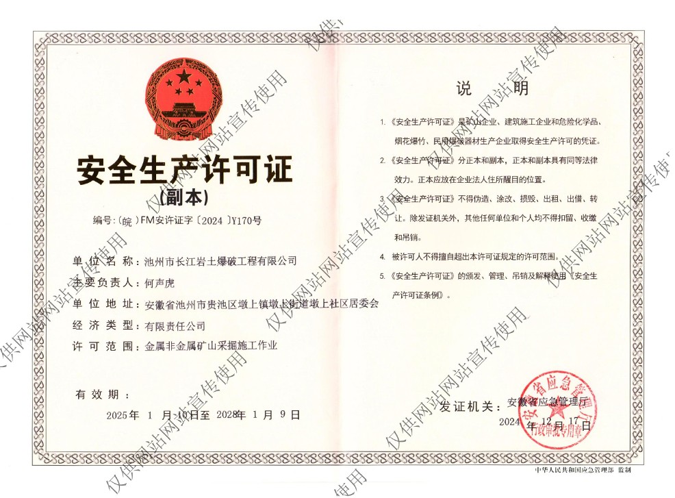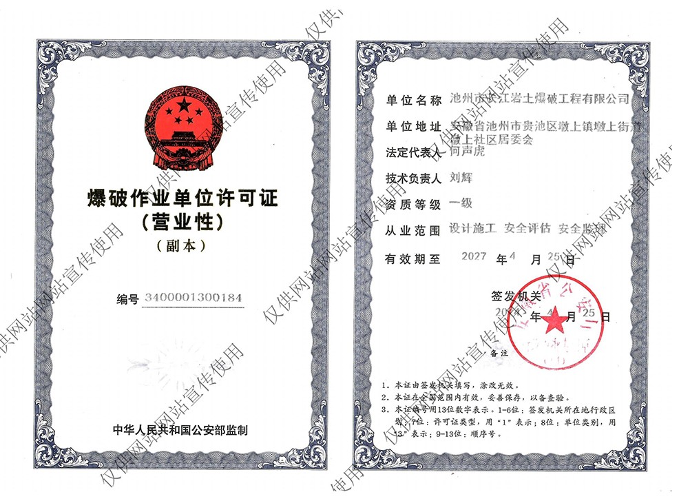 池州市長(zhǎng)江巖土爆破工程有限公司是經(jīng)省、市、區(qū)公安機(jī)關(guān)核準(zhǔn),工商行政管理局登記注冊(cè)的具有獨(dú)立法人資格的爆破作業(yè)施工企業(yè)。公司成立于2007年,注冊(cè)資金5188萬(wàn)元,擁有一級(jí)爆破資質(zhì),二級(jí)礦山工程總承包資質(zhì)和非營(yíng)業(yè)性道路危險(xiǎn)貨物運(yùn)輸資質(zhì)。